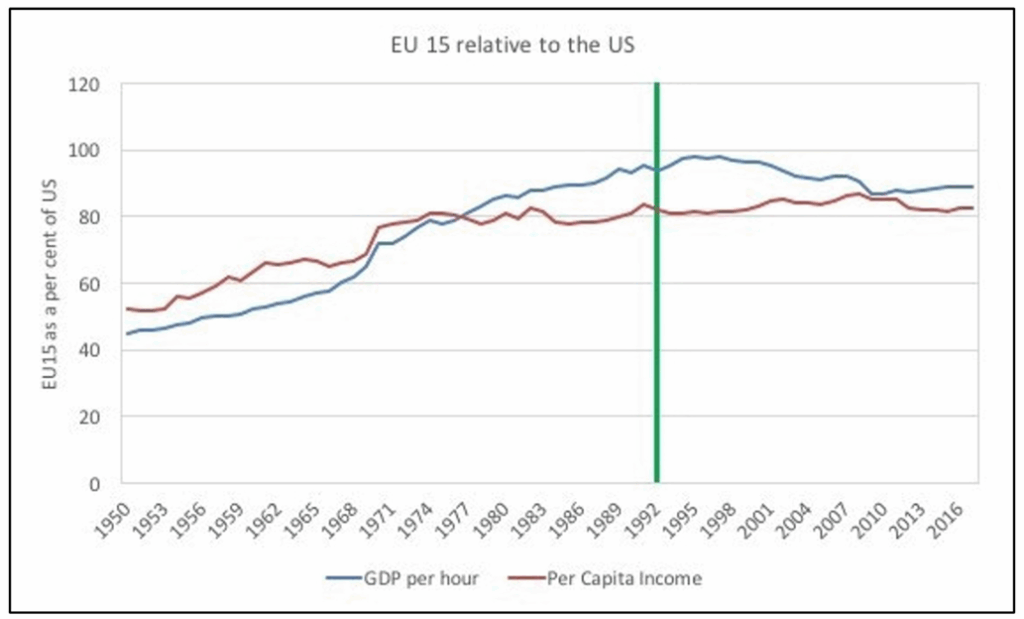 Al contrario, l’integrazione europea – attraverso le sue fasi successive, tra cui il Mercato Unico, l’Unione Europea post-Maastricht e l’introduzione della moneta unica – non è riuscita in larga misura a migliorare la performance economica degli Stati membri secondo la maggior parte dei parametri, sia collettivamente che, per molti paesi, individualmente, rispetto alle loro linee di tendenza pre-integrazione. Diversi paesi dell’eurozona hanno registrato risultati economici più deboli rispetto agli Stati membri dell’UE che hanno scelto di rimanere al di fuori dell’unione monetaria, mentre l’UE nel suo complesso ha costantemente registrato risultati inferiori rispetto agli Stati Uniti, un’entità economica comparabile.