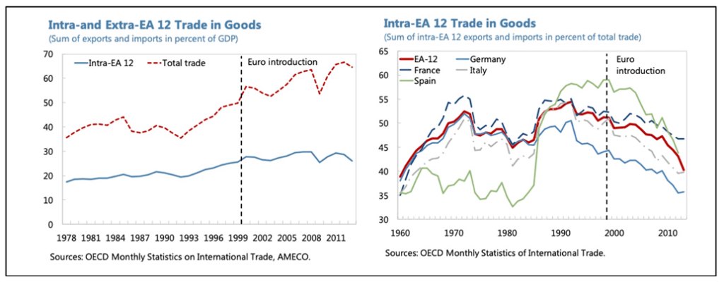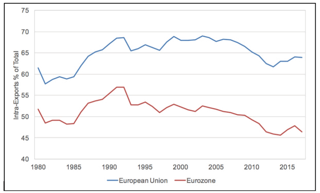 Questo declino si è accelerato in seguito alla crisi finanziaria globale del 2008, suggerendo che il quadro istituzionale dell’UE è particolarmente inadatto ad affrontare gravi shock economici. Come ha osservato uno studio del Fondo Monetario Internazionale (FMI) : “Contrariamente alle aspettative, vi sono poche prove che [l’euro] abbia stimolato il commercio. […] In percentuale sul commercio totale, il commercio intra-euro è aumentato da circa il 40% nel 1960 a circa il 55% al momento del Trattato di Maastricht nel 1992, ma è sceso al 40% nel 2013”.