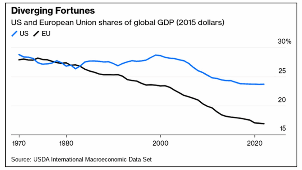 Le implicazioni di questa divergenza vanno oltre la performance economica relativa. La quota dell’UE sul PIL globale si è contratta dal 27 al 16% negli ultimi trent’anni, mentre gli Stati Uniti sono rimasti stabili intorno al 25%, riflettendo non solo una performance inferiore rispetto agli Stati Uniti, ma anche una più ampia perdita di influenza economica nell’economia globale. Come ha osservato Adrian Wooldridge, editorialista di Bloomberg: “La quota americana sul PIL globale si attesta ancora non lontano da quella del 1980. È l’Europa, piuttosto che gli Stati Uniti, a pagare l’ascesa dell’Asia in termini di una quota decrescente del PIL globale”.