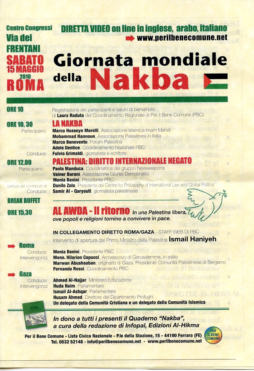Non avrei scritto queste righe, inadeguate a descrivere un dramma umano, se non mi sentissi in dovere di difendere un vecchio da un attacco ignobile, come sempre, da parte dei “Corretti Informatori”, che almeno questo volta non devono essere stati bene informati dal Mossad. Speravo di incontrare mons. Capucci per la seconda volta sabato scorso, 15 maggio 2010, in occasione della “Giornata della Nakba”, che si è tenuta in Roma per tutta la giornata, con sessione antimeridiane e pomeridiane. Ma mons. Capucci non c’era, perché malato in ospedale! E dunque il Tizio lancia i suoi strali infami contro un degente che non poteva trovarsi nel luogo indicato. Quanto alla Giornata della Nakba, svoltasi al Centro Congressi di via dei Frentani, accanto all’ingresso principale dell’Università di Roma La Sapienza, si è trattato di una manifestazione assolutamente pacifica, serena ed ordinata,