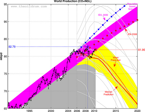 Secondo questo specialista, la maggior parte dei modelli matematici e contabili importanti della produzione di petrolio usato da enti indipendenti dal settore petrolifero indicano tutti un arco di tempo analogo in cui la produzione di petrolio raggiunge un massimo e comincia a declinare. Questo è un periodo di circa un decennio al centro tra il 2008 e il 2010, in cui il massimo della produzione si colloca tra 78 e 85 milioni di barili al giorno.