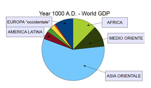 Di seguito illustro una mia elaborazioni dei dati prodotti da Maddison riguardo la distribuzione relativa del PIL reale mondiale (calcolato secondo il principio che il valore di un bene o servizio è lo stesso ovunque sia prodotto) nei seguenti anni D.C.: 1, 1000, 1500, 1820, 1913, 1950, 1989, 2006. La scelta degli anni è in parte dettata dalla carenza di informazioni e in parte dal significato storico. I raggruppamenti di paesi che considero sono elencati di seguito. Poichè i confini politici dei paesi sono variati molto durante il periodo in esame ogni raggruppamento è necessariamente una forzatura dal punto di vista dei blocchi politici e culturali esistenti nelle diverse epoche. Per questo l'analisi va intesa solo come geografica. Nel tentativo di rendere la fruizione dei risultati più agevole, ho scelto di raggruppare le regioni seguendo (approssimativamente) gli assetti del secondo dopo guerra. Europa “occidentale”: Austria, Francia, Norvegia, Irlanda, Belgio, Germania, Svezia, Grecia, Danimarca, Italia, Svizzera, Portogallo, Finlandia, Olanda, Regno Unito, Spagna, 14 piccoli paesi dell'Europa occidentale. Nuovi stati occidentali: Australia, Nuova Zelanda, Canada, Stati Uniti. Africa: Algeria, Angola, Benin, Botswana, Burkina Faso, Burundi, Camerun, Capo Verde, Chad , Isole Comore, Congo 'Brazzaville', Csta d'Avorio, Gibuti, Egitto, Guinea equatoriale, Eritrea, Etiopia, Gabon, Gambia, Ghana, Guinea, Guinea Bissau, Kenya, Lesotho, Liberia, Libia, Madagascar, Malawi, Mali, Mauritania, Mauritius, Marocco, Mozambico, Namibia, Nigeria, Ruanda, São Tomé and Principe, Senegal, Seychelles, Sierra Leone, Somalia, Sud Africa, Sudan, Swaziland, Tanzania, Togo, Tunisia, Uganda, Zaire (Congo Kinshasa), Zambia, Zimbabwe. Medio Oriente: Barhain, Iran, Iraq, Israele, Giordania, Kuwait, Libano, Oman, Qatar, Arabia Saudita, Turchia, Siria, Emirati Arabi Uniti, Yemen, Gaza e Cisgiordania. America Latina: Argentina, Cile, Brasile, Colombia, Messico, Perù, Uruguay, Venezuela, Bolivia, Costa Rica, Cuba, Repubblica Dominicana, Salvador, Equador, Guatemala, Haiti, Honduras, Jamaica, Nicaragua, Panama, Paraguay, Puerto Rico, Trinidad e Tobago. Asia Orientale: Cina, India, Indonesia, Giappone, Filippine, Korea del Sud, Korea del Nord, Thailandia, Taiwan, Bangladesh, Myanmar, Honk Kong, Malaysia, Nepal, Pakistan, Singapore, Sri lanka, Afghanistan, Cambogia, Laos, Mongolia, Vietnam. Paesi U.R.S.S.: Armenia, Azerbaijan, Bielorussia, Estonia, Georgia, Kazakhstan, Kyrrgyzstan, Lituania, Lettonia, Moldavia, Federazione Russa, Tajikistan, Turkmenistan, Ucraina, Uzbekistan. Paesi dell'Europa orientale: Albania, Romania, Bulgaria, Repubblica Ceca, Slovacchia, Ungheria, Polonia, Serbia, Montenegro, Kosovo. I grafici a torta presentati di seguito illustrano il valore relativo del PIL reale delle regioni indicate negli anni considerati. Alla nascita di Cristo, quando l'imperatore Ottaviano Augusto regnava su buona parte del mediterraneo, possiamo vedere che Europa, Africa e Medio Oriente producevano congiuntamente solo un terzo di quanto si produceva in Asia orientale. Senza alcun dubbio, il baricentro economico del globo si situava tra India, Cina e sud-est asiatico. Da notare che le Americhe, l'Europa orientale e le zone della futura URSS, avevano tutte una produzione piuttosto ridotta.