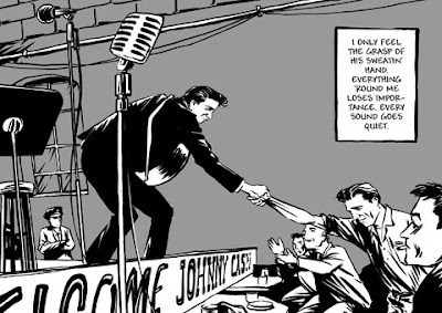 «Alla fine sono le storie che restano, non i fatti. E le storie vanno raccontate», sosteneva Cash. E di una a fumetti si sentiva la mancanza. A colmare tale lacuna è stato Reinhard Kleist (Hürth, 1970), appassionato di film western e disegnatore che, dopo un’intensa gavetta su soggetti di Lovecraft, è da diversi anni accreditato come miglior autore di fumetti in lingua tedesca. Ma è anche un fan di Cash e, in quanto tale, voleva saperne di più sull’uomo. «Volevo sapere – ha spiegato – chi è questo tipo che canta». Ha raccolto tutto quello che poteva: foto, articoli, interviste, biografie, testimonianze varie. Ne è venuta fuori Cash. I see the darkness (Black Velvet Editrice, Collana Biopop, pp. 222, € 16), graphic novel salutata come “miglior libro” al salone del fumetto di Berlino. È il suo tratto incisivo, rigorosamente in bianco e nero, a restituirci il vero Johnny Cash, sottolineandone i pregi (la generosità) senza trascurare i difetti (l’egocentrismo esasperato, l’inaffidabilità), le luci e le ombre di una vita vissuta senza mai perdere il gusto di spingersi oltre, di rimettersi in gioco. Come Franz Dobler ci ricorda sin dalla prefazione: «Nulla è sicuro nella vita, nel lavoro, in amore. Nessuno può dirsi sicuro. A meno che non si rinchiuda la propria vita, il proprio lavoro, i propri amori in un carcere di massima sicurezza».