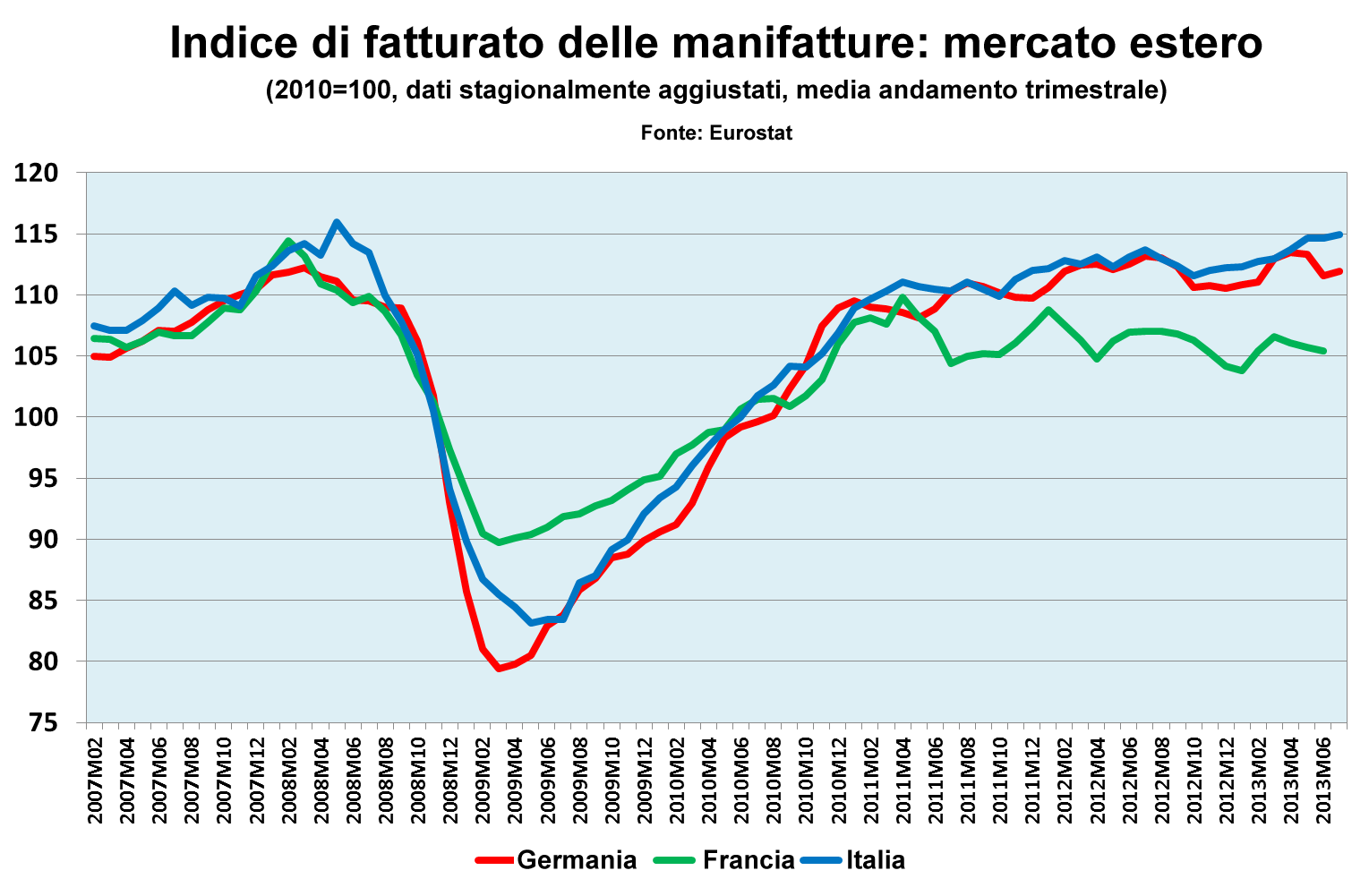 Il secondo grafico mostra l'andamento dell'industria per il mercato estero, paragonando l'indice con quelli della Germania e della Francia. In termini di esportazioni, i tre paesi si sono ripresi in modo molto simile, con l'Italia che va perfino un po' meglio degli altri.