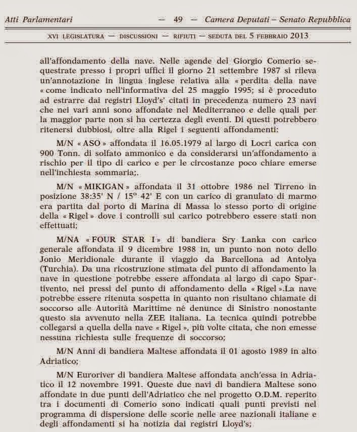 «I punti di affondamento delle navi "ANNI" e "EURORIVER", entrambe di bandiera maltese, di cui ai punti 9. e 16., trovano riscontro con i punti di dispersione delle scorie pericolose previste dal progetto O.D.M. del Comerio nella parte indicata dal punto C. AREE NAZIONALI ITALIANE».