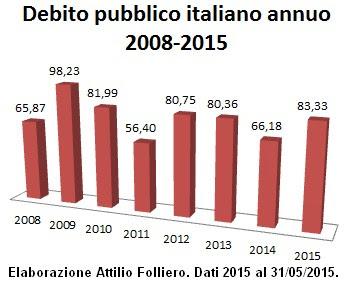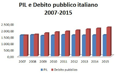 Dall’inizio della crisi, dal 2007 ad oggi (31 maggio 2015) il debito pubblico italiano è cresciuto di 613 miliardi: al 31 dicembre 2007 era 1.598,97 miliardi ed oggi, secondo l’ultimo dato disponibile è 2.218,23. Nello stesso periodo il PIL è rimasto praticamente invariato: era 1.610 miliardi nel 2007 ed è 1.616 miliardi nel 2014; nel 2015, secondo le previsioni crescerà 0,7%. e sarà attorno a 1.627 miliardi. In termini percentuali, se nel 2007 il debito rappresentava il 99% del PIL, oggi è attorno al 135% (Vedasi tabella seguente e grafici).