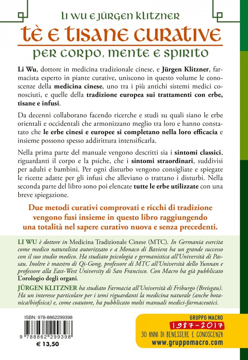 Il famoso medico esperto di medicina tradizionale cinese Li Wu e il farmacista e esperto di piante curative Jürgen Klitzner percorrono una nuova via: mettono insieme due grandi tradizioni curative, la medicina cinese di 5000 anni e le conoscenze europee quasi bimillenarie sui trattamenti naturali con erbe, tisane e infusi.